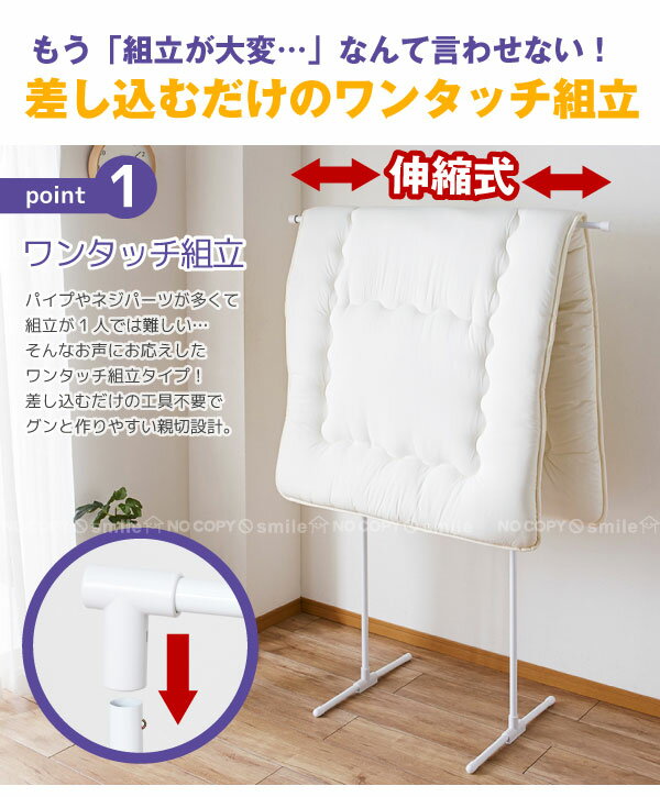 【干せる量の目安】シャツ(約)16枚、スポーツタオル(約)3枚orシングル布団(約)1枚 ワンタッチ組立で簡単!室内物干しシリーズ X型室内物干し(1〜2人用) X型伸縮室内物干し(1〜3人用) T型室内物干し(1〜2人用) サイズ 使用時:(約)幅68〜116×奥行52×高さ158cm 収納時:(約)幅109×奥行6×高さ158cm 耐荷重 総耐荷重:最大(約)7.5kgまで パイプ1本あたり:(約)4kgまで 伸縮アーム:各(約)1kgまで タオル掛け:(約)1.5kgまで 材質 パイプ・ワイヤー類:鉄製 エポキシ樹脂粉体塗装 樹脂部品:ABS樹脂・PP樹脂・PE樹脂 ねじ類・金具:鉄製 メッキ仕上げ キーワード 物干し 室内 折りたたみ T型室内物干し SMW-3 室内物干し 室内用物干し 伸縮 伸びる 室内 折りたたみ 部屋干し 布団 布団干し 洗濯干し 洗濯用品 ランドリー 洗濯機 ものほし 工具不要 1〜2 人 工具不要 コンパクト シャツ タオル ふとん 敷き布団 シングル 単身者 単身赴任 カップル 201601-02