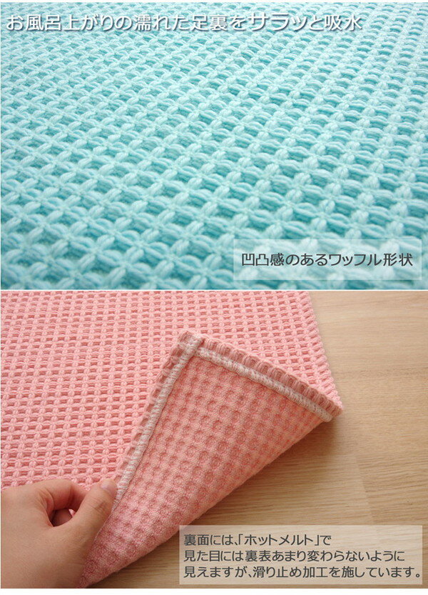【ポイント10倍】バスマット フロアマット 洗える 吸水 速乾 バリアフリー つまづきにくい 『ワッフル』 ピンク 約35×50cm