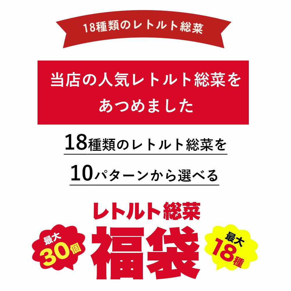 【品名(名称)】 18種類 10パターンから選べる レトルト惣菜福袋 最大30食セット 【原材料名】 ●ビーフカレー中辛 1袋 たまねぎ、牛肉、りんごピューレ、小麦粉、ラード、チャツネ、トマトペースト、カレー粉、ポークエキス、食塩、砂糖、トマトケチャップ、全粉乳、ココナッツミルク、はちみつ、油脂加工食品、ミルポアペースト、香辛料、調味料(アミノ酸等)、カラメル色素、(原材料の一部に卵、大豆、鶏肉、バナナを含む) ●ビーフカレー辛口 1袋 たまねぎ、牛肉、小麦粉、ラード、りんごピューレ、乳又は乳製品を主要原料とする食品、カレー粉、砂糖、食塩、チャツネ、トマトケチャップ、はちみつ、ポークエキス、ガーリックペースト、複合調味料、ココナッツパウダー、ミルポアペースト、青唐辛子ペースト、香辛料、調味料(アミノ酸等)、カラメル色素、(原材料の一部に卵、大豆、鶏肉、バナナを含む) ●ビーフカレー甘口 1袋 たまねぎ、牛肉、小麦粉、ラード、りんごペースト、砂糖、食塩、コンソメパウダー、カレー粉、チャツネ、ソテーオニオン、はちみつ、トマトペースト、ミルポアペースト、香辛料、乳糖、ミルクカルシウム、乳たん白、調味料(アミノ酸等)、カラメル色素、香辛料抽出物、炭酸Na、クエン酸、(原材料の一部に鶏肉、バナナを含む) ●チキンカレー200g 野菜(たまねぎ、にんじん)、鶏肉、小麦粉、ラード、砂糖、トマトペースト、食塩、ココナッツミルクパウダー、香辛料、カレー粉、コンソメパウダー、ガーリックペースト、調味料(アミノ酸)、(原材料の一部に乳成分、大豆を含む) ●ポークカレー中辛200g たまねぎ、りんごピューレー、小麦粉、豚肉、ラード、チャツネ、トマトペースト、カレー粉、ポークエキス、食塩、砂糖、トマトケチャップ、全粉乳、ココナッツミルク、はちみつ、ミルポアペースト、油脂加工食品、香辛料、乳糖、乳たん白、ミルクカルシウム、粉末卵白/調味料(アミノ酸等)、カラメル色素、炭酸Na、クエン酸、(一部に小麦・卵・乳成分・大豆・鶏肉・バナナ・豚肉・りんごを含む) ●ミートソース 1袋 野菜(トマト、セロリ、にんにく)、牛肉、トマトペースト、ソテーオニオン、トマトケチャップ、果糖ぶどう糖液糖、食塩、砂糖、植物油、バター、香辛料、増粘剤(加工でん粉)、調味料(アミノ酸等)、(原材料の一部に豚肉を含む) ●パスタソース カルボナーラ 1袋 たまねぎ、りんごピューレー、小麦粉、牛肉、ラード、チャツネ、トマトペースト、カレー粉、ポークエキス、食塩、砂糖、トマトケチャップ、全粉乳、ココナッツミルク、はちみつ、ミルポアペースト、油脂加工食品、香辛料、乳糖、乳たん白、ミルクカルシウム、粉末卵白/調味料(アミノ酸等)、カラメル色素、炭酸Na、クエン酸、(一部に小麦・卵・乳成分・牛肉・大豆・鶏肉・バナナ・豚肉・りんごを含む) ●パスタソース ナポリタンソース 1袋 野菜(たまねぎ、にんじん、ピーマン、にんにく)、トマトケチャップ、トマトペースト、マッシュルーム、糖類(砂糖、果糖ぶどう糖液糖、大豆油、無塩せきベーコン、ポークエキス、食塩、マーガリン、香辛料、増粘剤(加工でん粉)、調味料(アミノ酸等)、着色料(カロチノイド、カラメル)、酸味料、(原材料の一部に小麦、卵、乳成分を含む) ●パスタソース ボンゴレビアンコ 1袋 野菜(たまねぎ、セロリ、ピーマン、にんにく)、あさり、ワイン、植物油、チキンブイヨン、でん粉、食塩、たん白加水分解物、コンソメパウダー、砂糖、香辛料、調味料(アミノ酸等)、(原材料の一部に乳成分、大豆を含む) ●いわし丼 1袋 いわし(北海道道東産)、砂糖、醤油、馬鈴薯でん粉(遺伝子組換でない)、醸造調味料、食用なたね油、清酒、しょうが、醸造酢、米発酵調味料、(原材料の一部に小麦、大豆:遺伝子組み換え不分別を含む) ●さば味噌煮丼 1袋 さば(北海道産)、米みそ、砂糖、米醸造調味料、青唐辛子(北海道産)、食用なたね油、米発酵調味料、pH調整剤(クエン酸)、(一部にさば・大豆を含む) ●にしん親子丼 1袋 にしん(北海道産)、しょう油、数の子、砂糖、でん粉、米醗酵調味料、醸造酢、酵母エキス/pH調整剤(クエン酸)、(一部に小麦・大豆を含む) ●さばがぱお 1袋 さば(北海道産)、食用なたね油、オイスターソース、豆板醤、魚醤、醸造酢、砂糖、食用ごま油、にんにく、食塩、香辛料/調味料(アミノ酸)、(一部にさば・ごまを含む) ●激辛麻婆 1袋 食肉(牛肉(国産)、豚肉(国産))、野菜(葱、生姜)、みそ、醤油、ごま油、砂糖、おろしにんにく加工品、香辛料、豆板醤、甜麵醤、オイスターエキス、チキン調味エキス、トウチ醤、チキン調味バウダー、食塩、ナツメ、クコの実/増粘剤(加工澱粉)、調味料(アミノ酸等)、香辛料抽出物、着色料(カラメル)、酸味料、(一部に小麦・牛肉・ごま ・大豆・鶏肉・豚肉・ゼラチンを含む) ●ルーローハン 1袋 豚肉(デンマーク産)、醤油、砂糖、たけのこ水煮、老酒、乾しいたけ、乾燥きくらげ、生姜、オイスターエキス、食