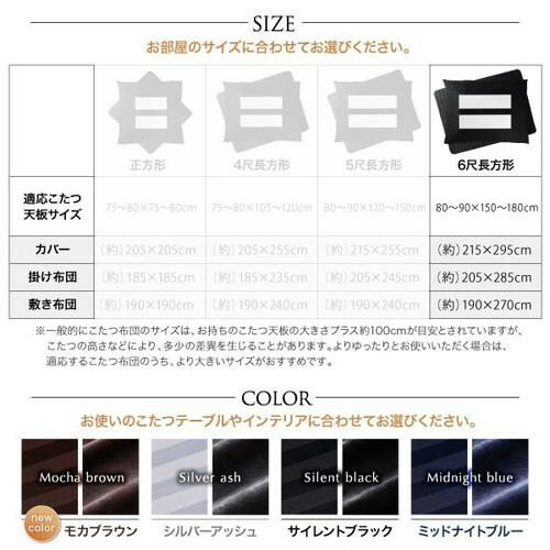 [サイズ]*正方形 カバー:(約)205 205cm掛け布団:(約)185 185cm敷き布団:(約)190 190cm 適応こたつ机天板サイズ:75〜80 75〜80cm*4尺長方形カバー:(約)205 255cm掛け布団:(約)185 235cm敷き布団:(約)190 240cm適応こたつ机天板サイズ:75〜80 105〜120cm*5尺長方形カバー:(約)215 255cm掛け布団:(約)205 245cm敷き布団:(約)190 240cm適応こたつ机天板サイズ:80〜90 120〜150cm*6尺長方形カバー:(約)215 295cm掛け布団:(約)205 285cm敷き布団:(約)190 270cm適応こたつ机天板サイズ:80〜90 150〜180cm【生地】[カバー]側地:綿 50%、ポリエステル 50%[こたつ布団]掛け布団:(表地・中わた・裏地)ポリエステル100%敷き布団:(表地・中わた・裏地)ポリエステル100%【生産国】中国【注意事項】※サイズは概算です。