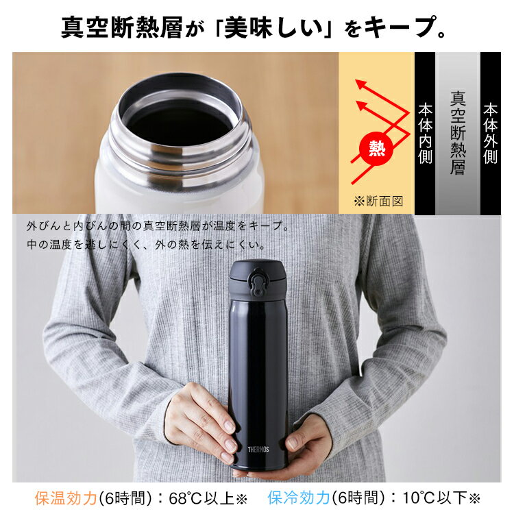 ●商品サイズ(cm)幅約6.5×奥行約7.5×高さ約22.0●商品重量/容量約210g/500ml●材質内びん:ステンレス鋼胴部:ステンレス鋼(アクリル樹脂塗装)フタ・せん本体・飲み口:ポリプロピレンフタパッキン・せんパッキン:シリコーンゴム●保温効力(6時間)68度以上●保冷効力(6時間)10度以下●カラークリームホワイト、ライトピンク、メタリックレッド、パールブラック、パウダーブルー(検索用:マグボトル 真空断熱 ワンタッチ 水筒 携帯マグ THERMOS 通勤 通学 スポーツ 4562344369244 4562344369213 4562344369220 4562344369251 4562344369237) ・商品型番 JNL-503→JNL-504★